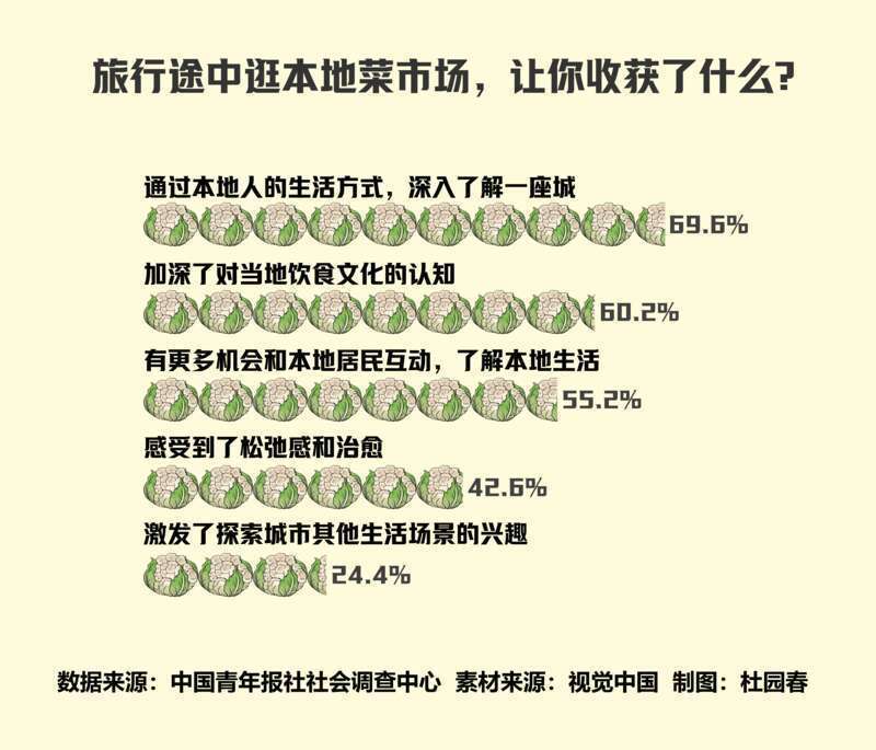 日前,中国青年报社社会调查中心联合问卷网(wenjuan.com),对1337名青年进行的一项调查显示,69.6%的受访青年表示旅行途中逛菜市场,可以通过本地人的生活方式深入了解一座城。升级改造菜市场,59.5%的受访青年希望环境卫生整洁,区域划分清晰;54.1%的受访青年期待市井氛围浓郁,保留本土特色。