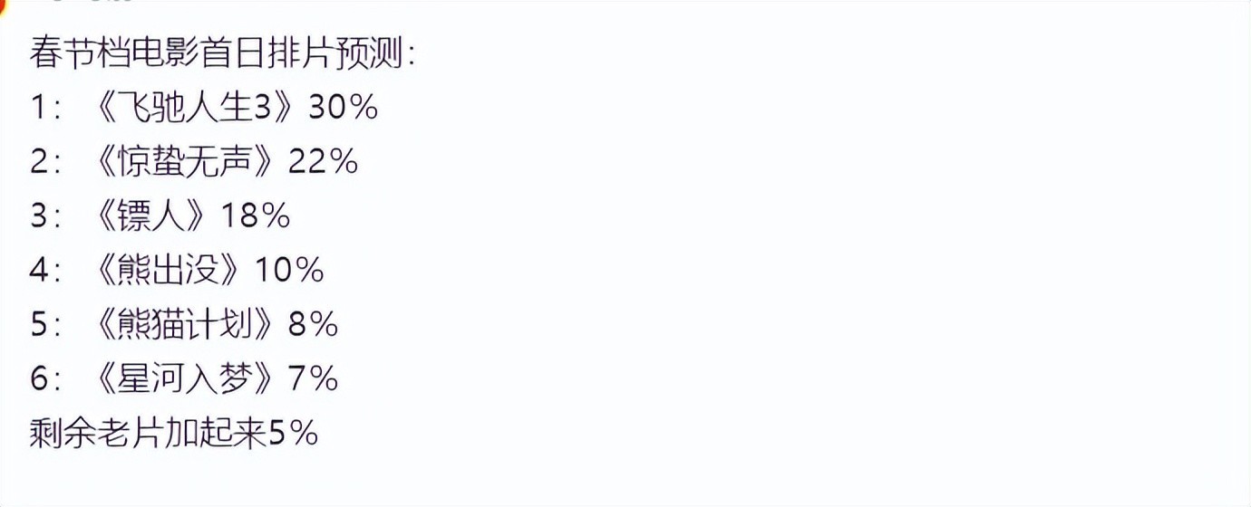 大部分网友都知道前四部,《飞驰人生3》的主演是沈腾,《惊蛰无声》全员“金鸡奖”,《镖人:风起大漠》主打武侠,《熊出没·年年有熊》每年都会与观众见面,相比之下,《熊猫计划2》和《星河入梦》的热度就比较低了。